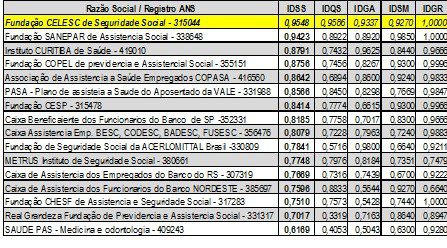 A CELOS obteve o primeiro lugar no grupo (ver tabela abaixo) na qual está enquadrada: autogestão de planos ambulatoriais, hospitalares e odontológicos, com 20 mil a 99.999 beneficiários. Do total de 1.057 operadoras avaliadas, a CELOS está classificada em 29º, no que se refere às 768 operadoras médico-hospitalar, a posição da CELOS é 7º.